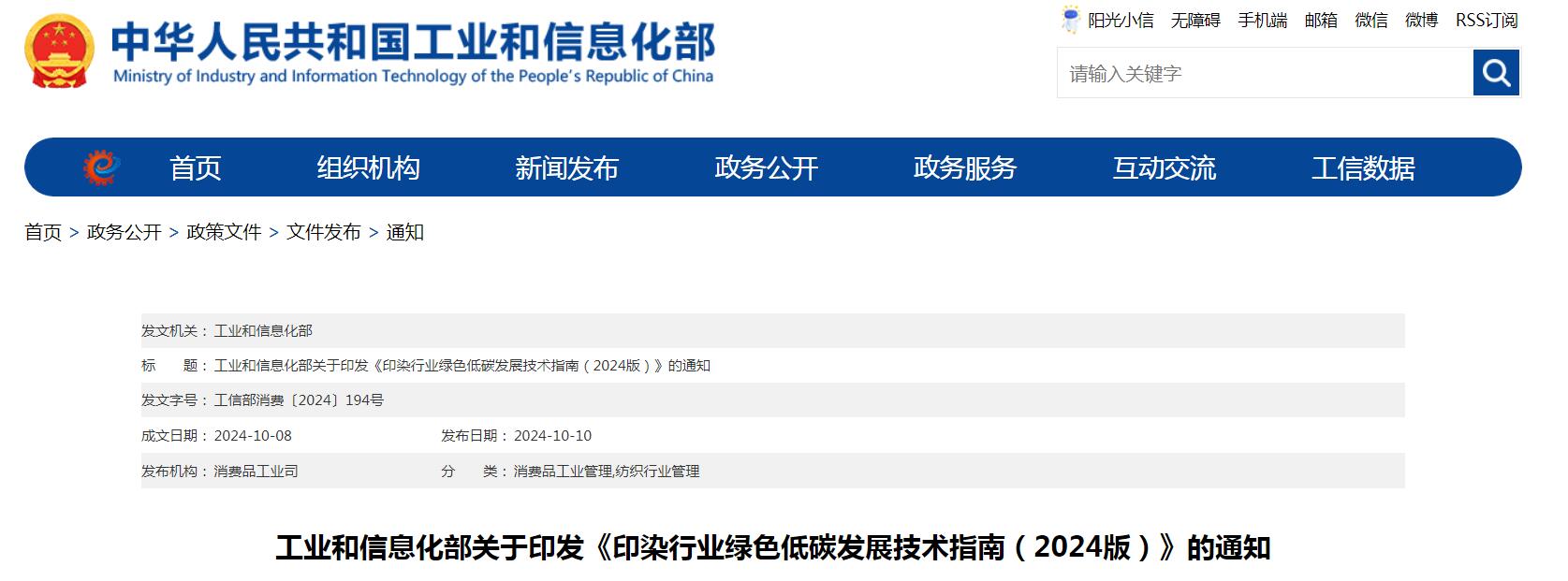 为进一步加快印染行业结构调整和转型升级,我部对《印染行业绿色发展技术指南(2019版)》进行了修订,形成《印染行业绿色低碳发展技术指南(2024版)》,现印发给你们。请结合各地实际,认真贯彻执行。