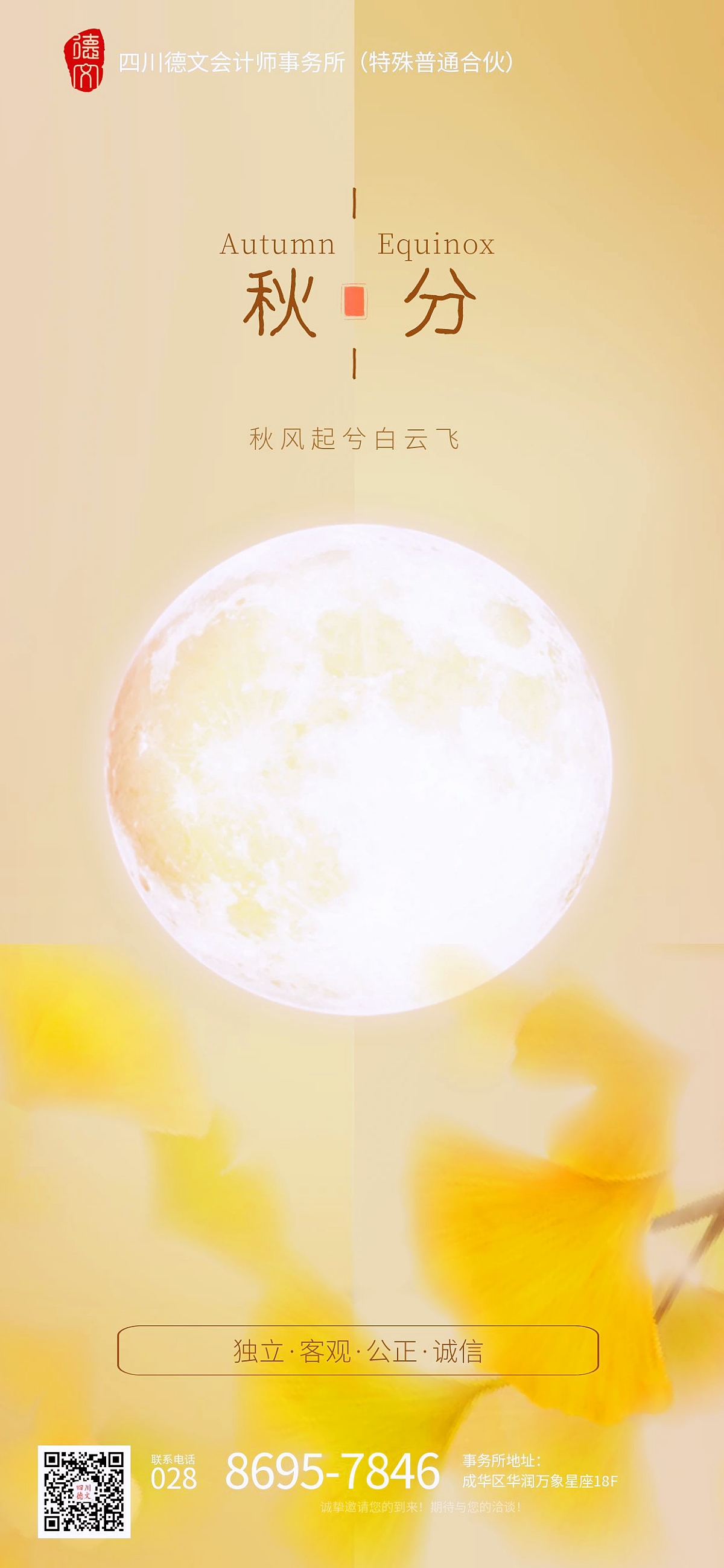 在这样的日子里,四川德文会计师事务所(特殊普通合伙)也愿与您共享这份秋的静谧与澄澈。我们秉持“独立、客观、公正、诚信”的原则,如同这秋分的明月般,以专业与专注,为您的财务事宜照亮方向;亦如这金黄银杏叶,用细致与认真,为您的每一项需求添上温暖注脚。