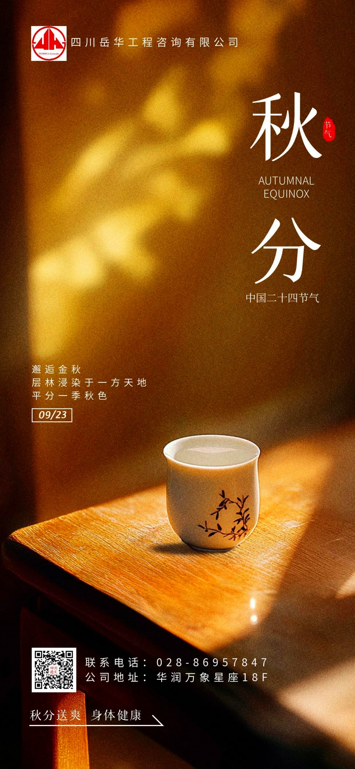 四川岳华工程咨询有限公司也借这秋分的清风,为您捎去一份惦念:愿您在这清爽宜人的时节,既收获工作里的扎实成果,也能偷得浮生半日闲——伴着茶香与暖阳,感受岁月静好,更愿您身体安康、事事顺遂。秋分送爽,美好常伴~