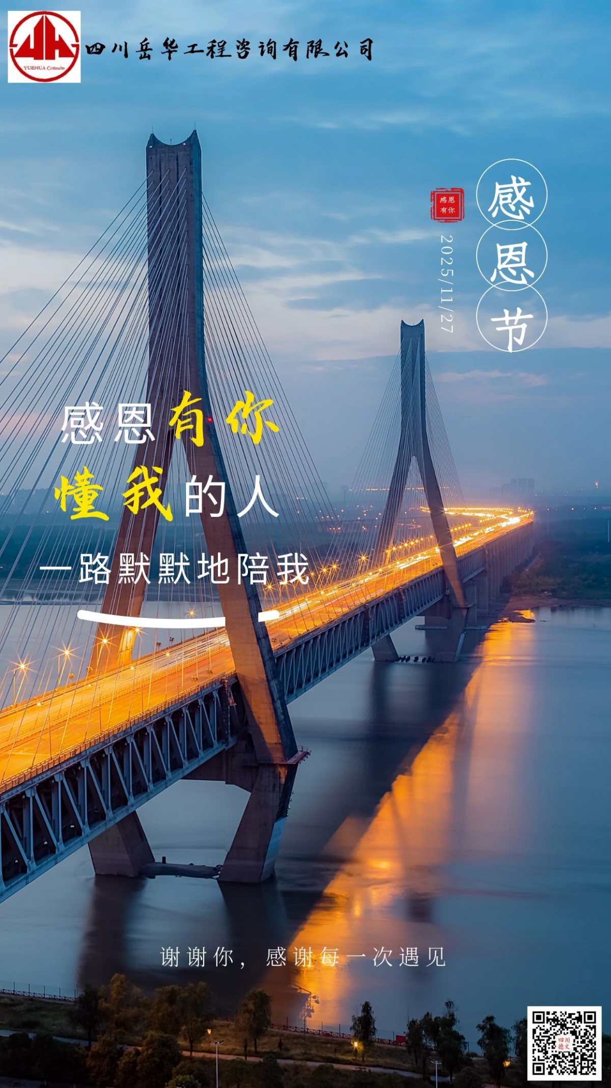 谢谢你,每一位在我们工程之路上遇见的人。感恩有你,让我们在工程咨询的征途上,不惧挑战,不断前行。未来,四川岳华工程咨询有限公司将继续以专业为基,以感恩为翼,在工程建设的广阔天地里,搭建更多放心桥、品质桥,回馈每一份信任,不负每一次遇见。