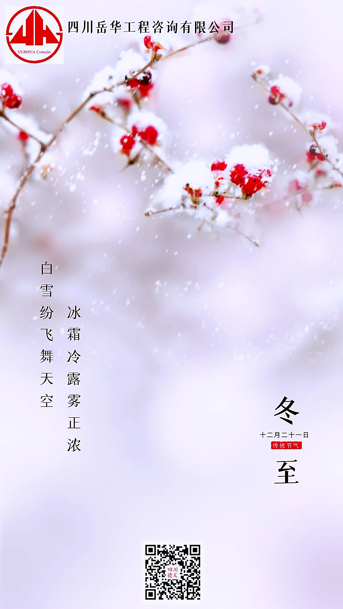 霜雾正浓,白雪漫舞,十二月二十一日的冬至,携着冬日最厚重的诗意而来。当雪花轻覆枝头,红果凝霜而立,四川岳华工程咨询有限公司与你一同,在这昼短夜长的极致时刻,感受冬日的静美与新生的希望。