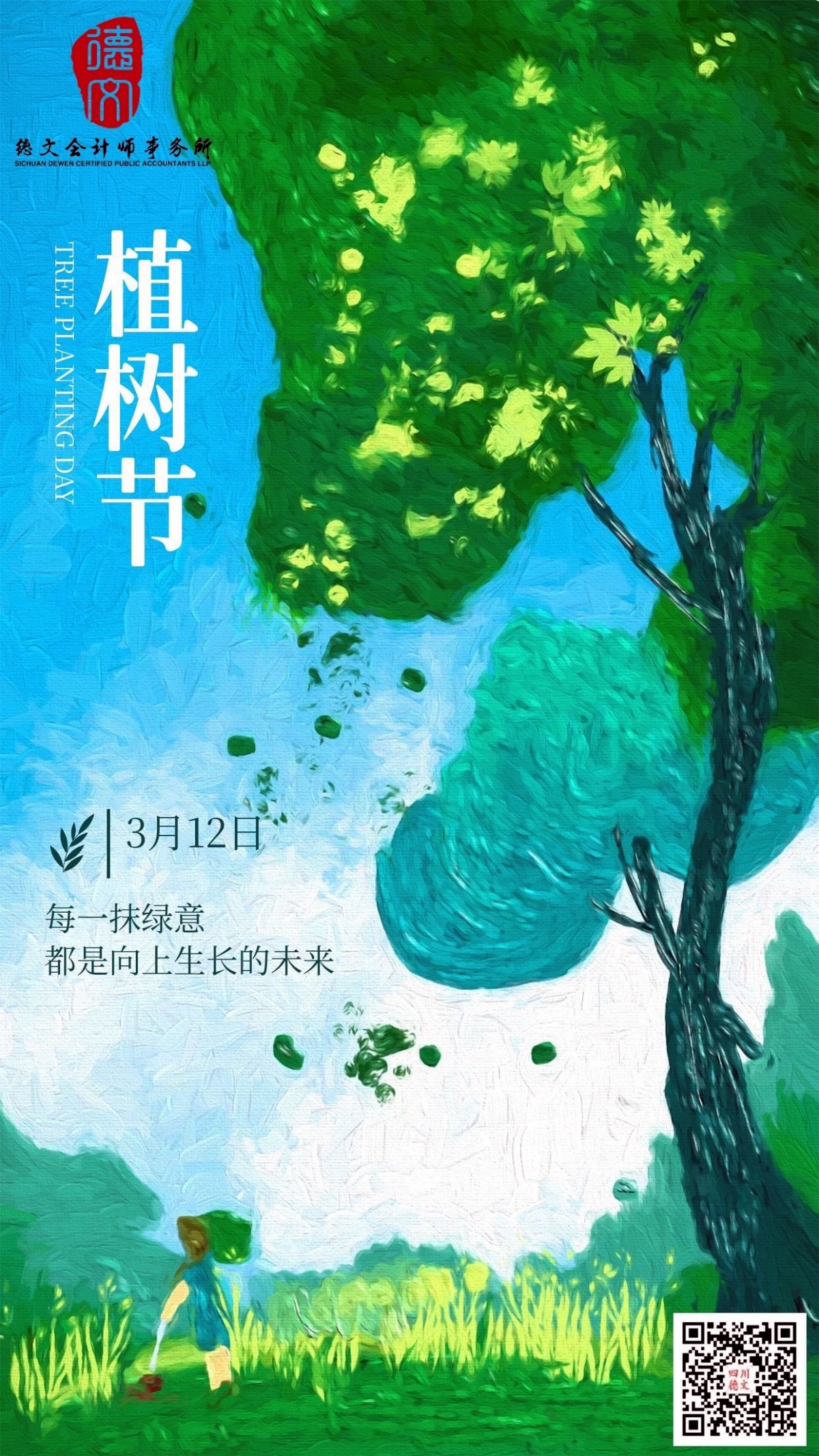 3月12日植树节,四川德文会计师事务所(特殊普通合伙)邀你共赴绿意之约。每一抹绿意,都是向上生长的未来;每一次耕耘,都为美好未来埋下伏笔。以行动守护自然,用初心播种希望,让我们携手相伴,让绿意铺满大地,共赴蓬勃新生。