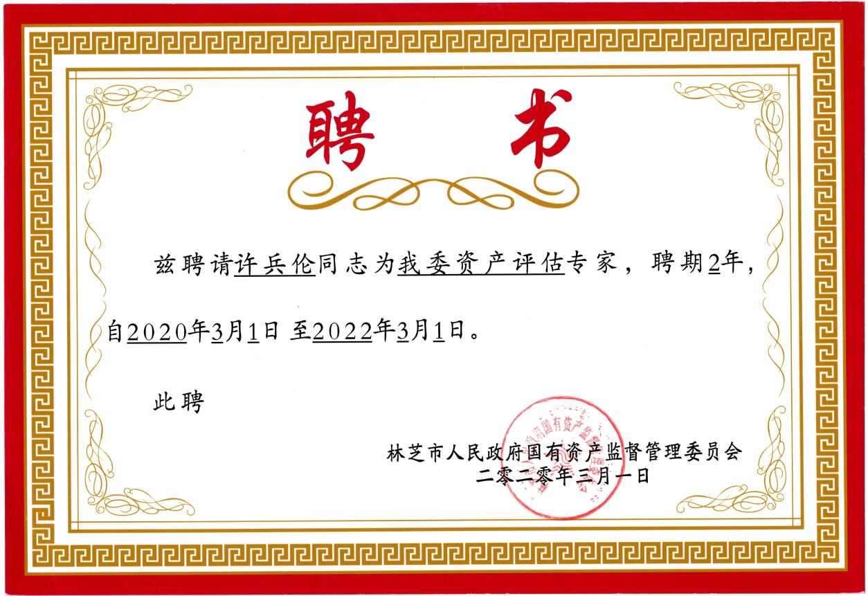202031日,四川德文咨询集团首席合伙人许兵伦被西藏自治区林芝市人民政府国有资产监督管理委员会聘为资产评估专家,自202031日至202231日,任期2年。