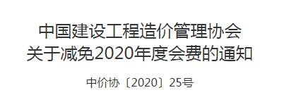 为深入贯彻落实党中央、国务院决策部署,统筹推进新冠肺炎疫情防控和经济社会发展,助力企业复工复产、共渡难关,经中国建设工程造价管理协会(以下简称“中价协”)常务理事会批准,现对2020年度会费做适当减免,具体内容通知如下: