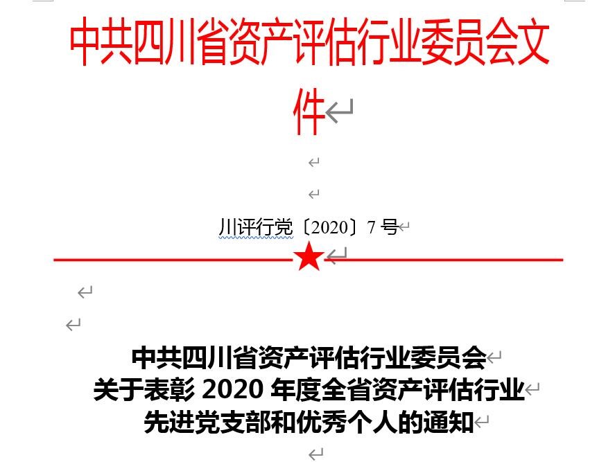 根据中共四川省资产评估行业委员会川评行党〔2020〕7号文件,关于表彰2020年度全省资产评估行业先进党支部和优秀个人的通知。四川大家房地产资产评估有限公司谢宇老师被评为“优秀共产党员”。