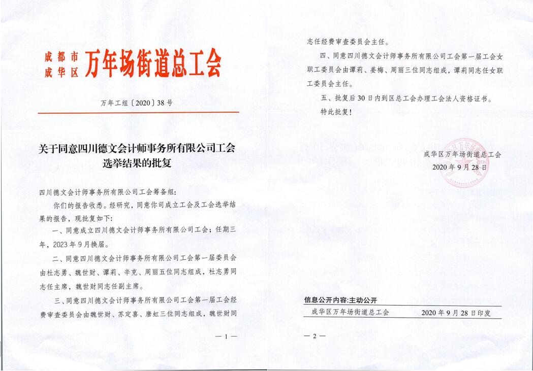 2020928日,四川德文喜获街道总办工会《关于同意四川德文会计师事务所有限公司工会选举结果的批复》。