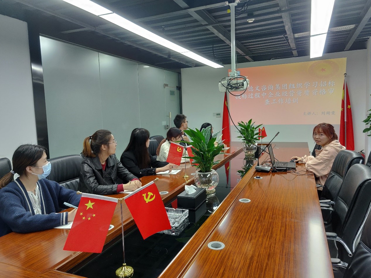 2020年10月12日,四川德文咨询集团组织学习招标投标过程中企业经营资质资格审查工作培训,本次培训由刘绮雯主讲,参加人员为各部门同事。