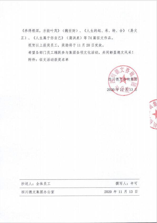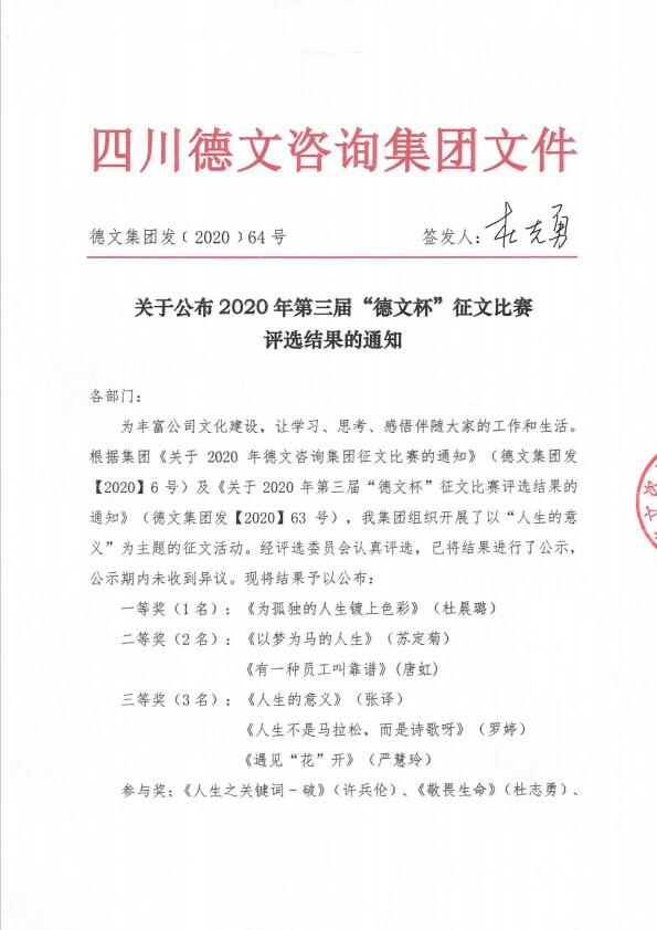 为丰富公司文化建设,让学习、思考、感悟伴随大家的工作和生活。根据集团《关于2020年德文咨询集团征文比赛的通知》(德文集团发【2020】6号)及《关于2020年第三届“德文杯”征文比赛评选结果的通知》(德文集团发【2020】63号),我集团组织开展了以“人生的意义”为主题的征文活动。